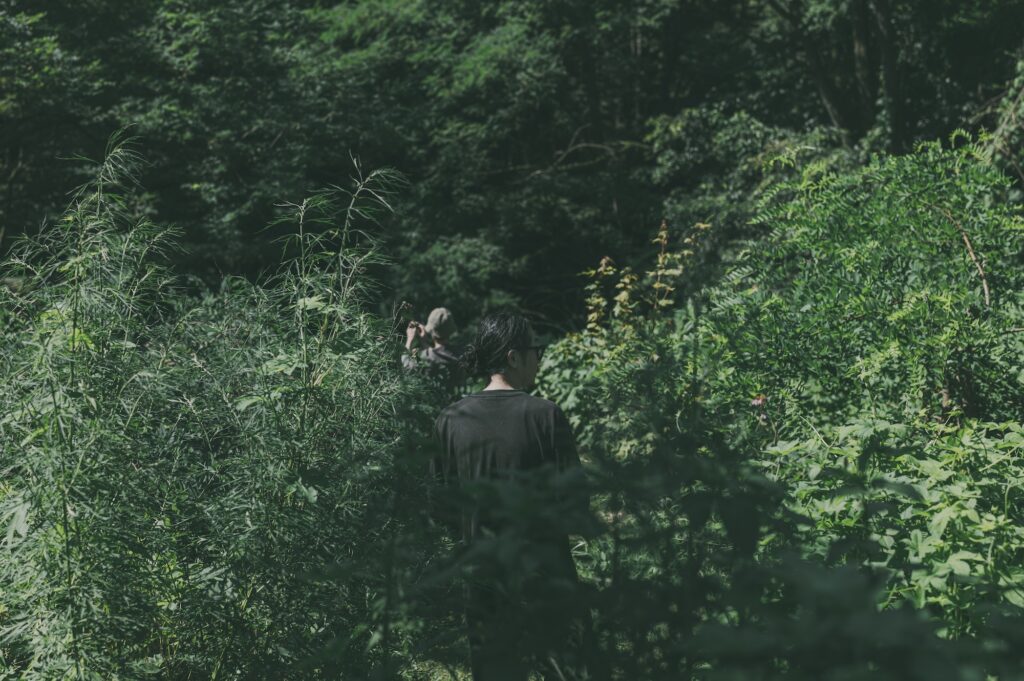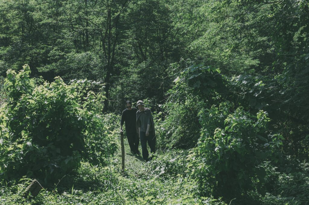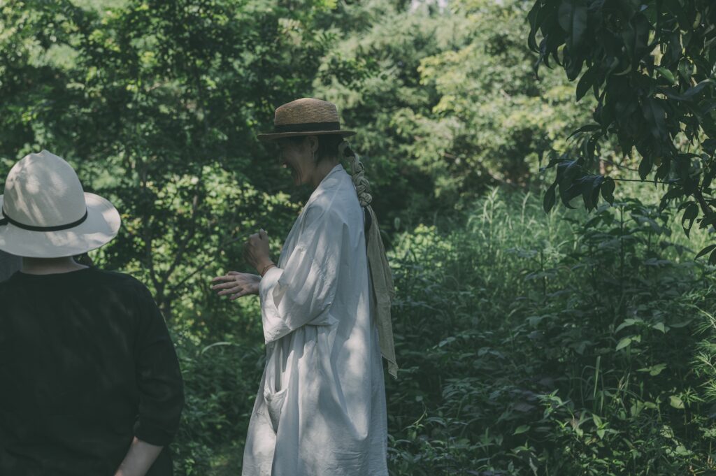 受注会のために山梨にきているケンゾーさんと一緒にヨシカさんのところに遊びに行く。陽が出ると朝でも暑いんですが森の中の木陰エリアを歩くと涼しい。