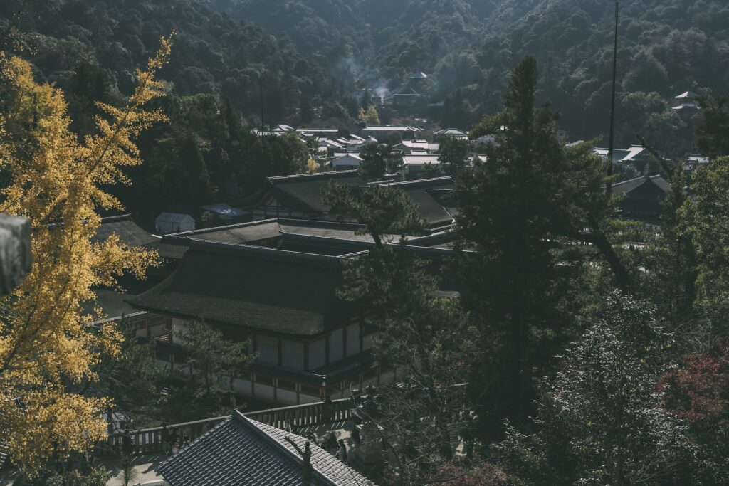 厳島神社が参拝行列ができていて、とても並ぶ気にはなれなかったので今回は諦めました。桃山時代に豊臣秀吉によって建てられた千畳閣へ。紅葉が綺麗で、眼下に厳島神社。良い季節だな。