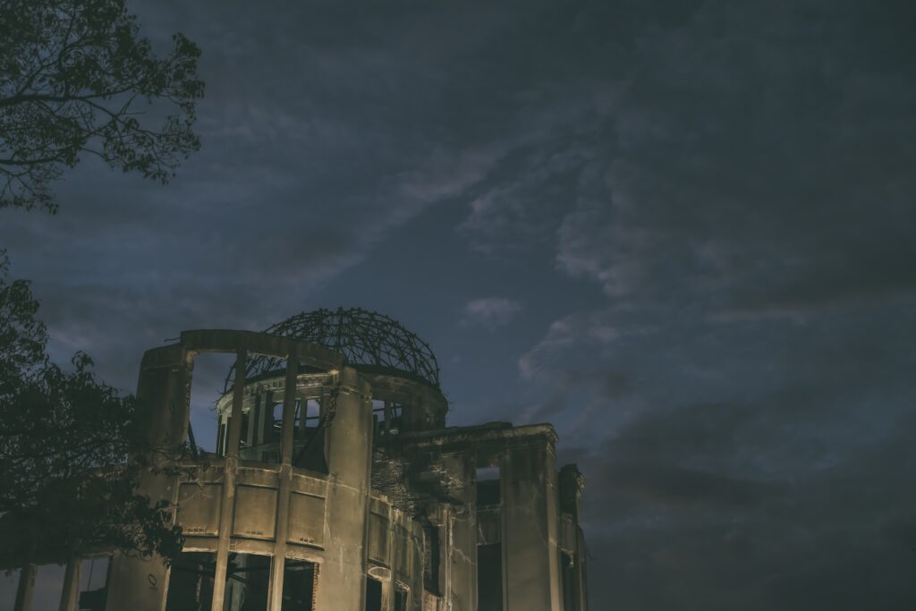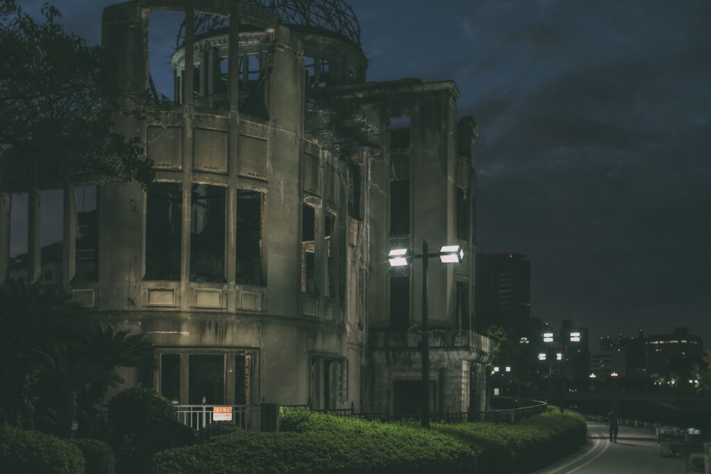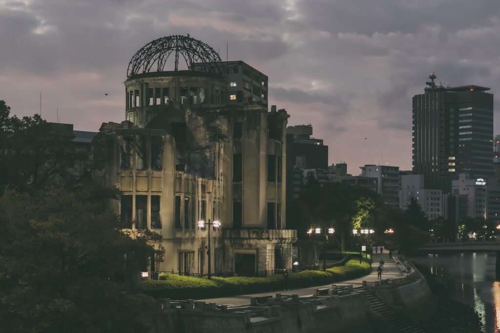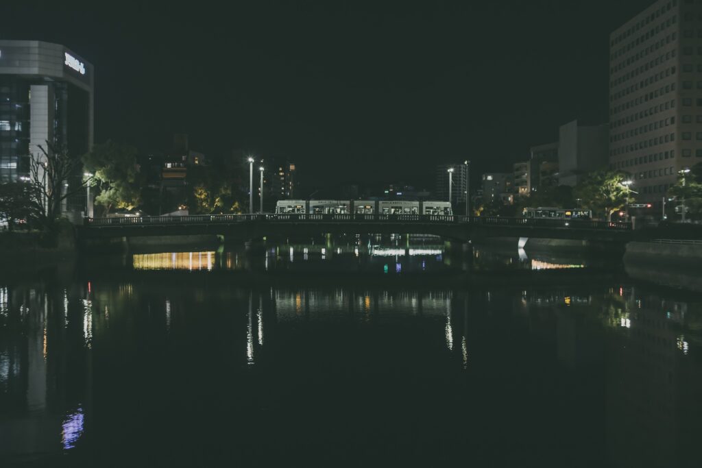 最終日も旅の定番となっている朝散歩。まだ外は暗いのですが明け方の原爆ドームを見るためにはこのくらいどうってことないのです。人も少なく、ライトアップも良い雰囲気です。