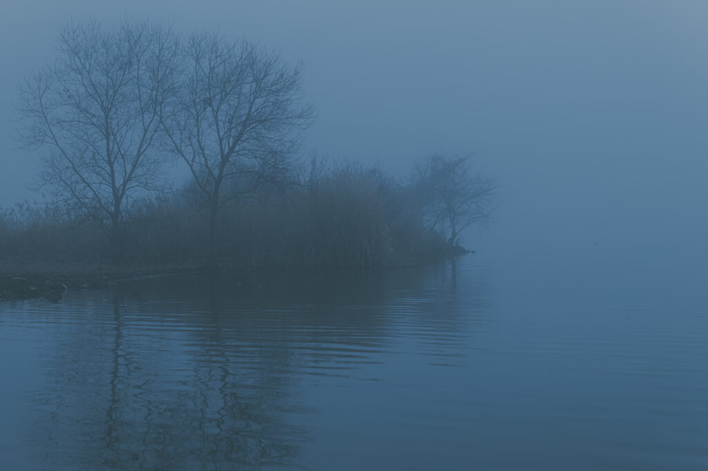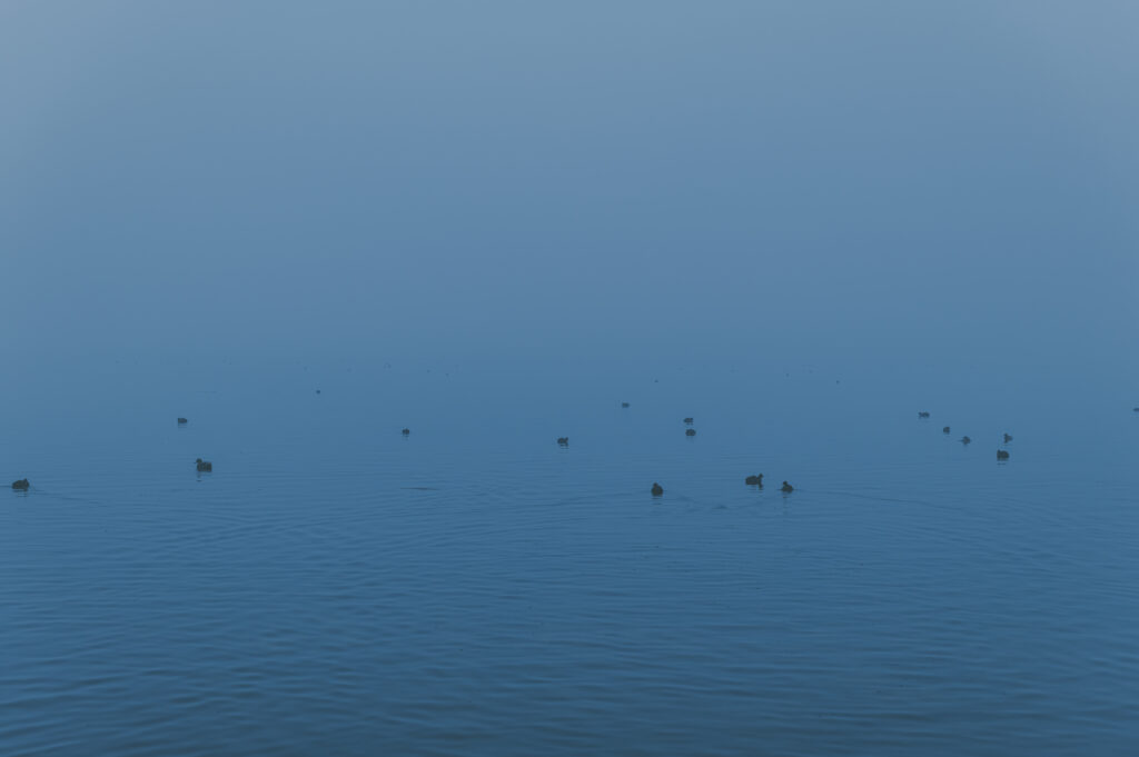 霧に包まれた朝。対岸が見えない時は湖というよりは海のような気持ちの良さを感じる。