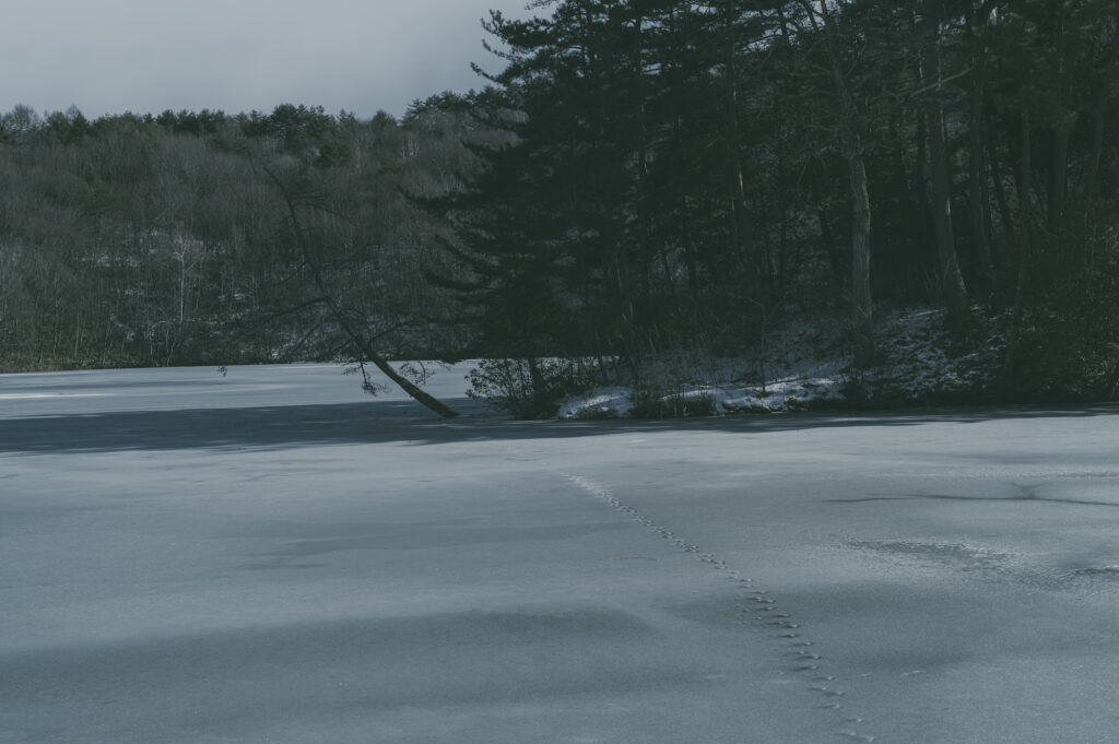 あまり行ったことのない地域へ。湖に張った氷の上を歩いて渡った足跡。なんか幻想的ですね。
