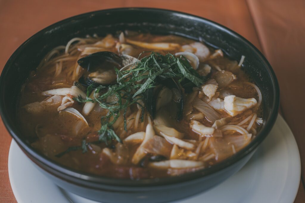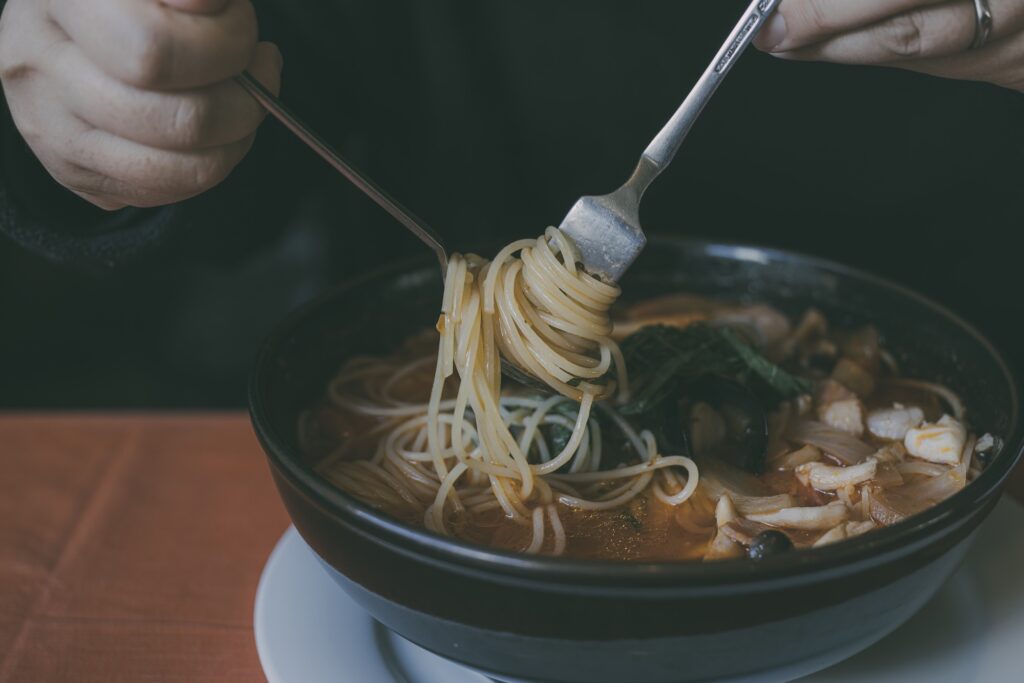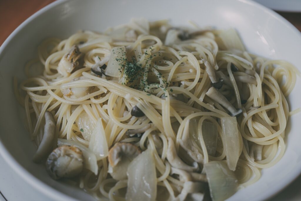 ペスカのパスタ。ペスカトーレも美味しいですが、ホタテとキノコのパスタは絶品だな。
