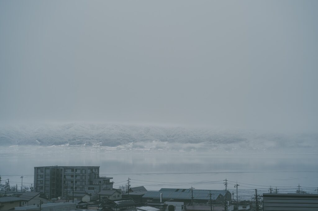 雨上がりの風景。対岸の山は雪だったようだ。