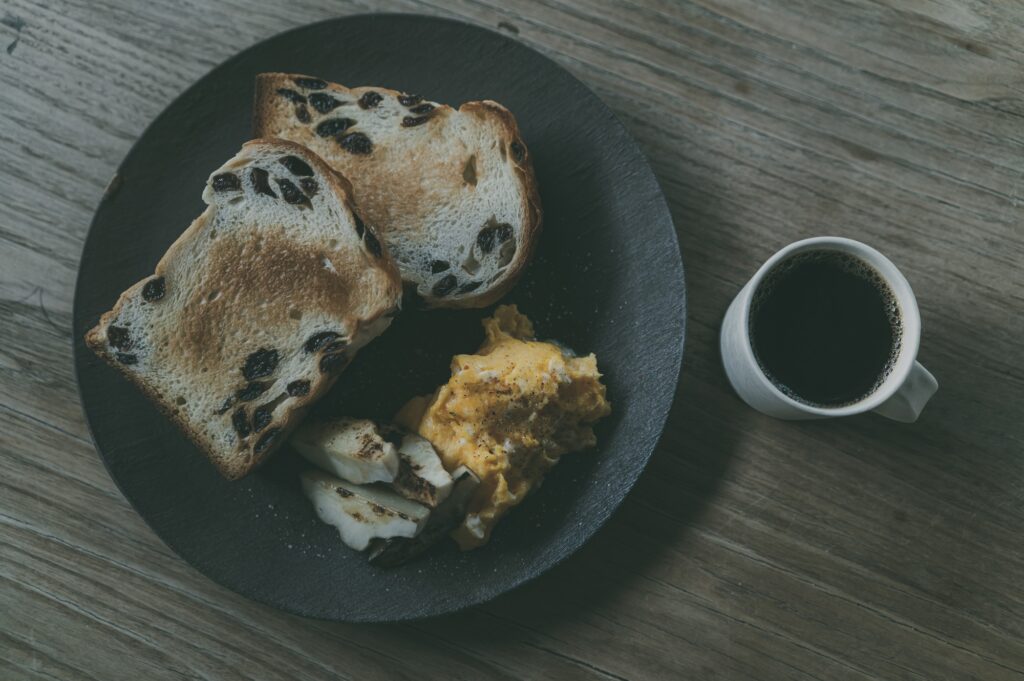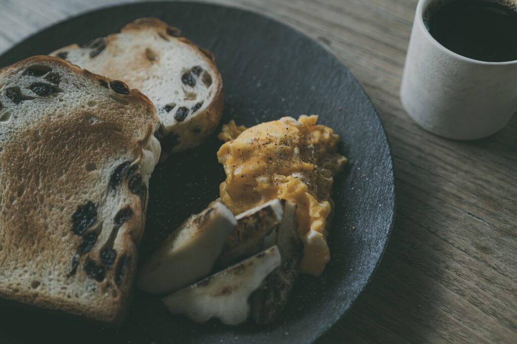 レーズンパンって好きなんですよね。バターとの相性抜群。そして、スクランブルエッグに菊芋の素焼き。今日も良い1日になりそうだ。