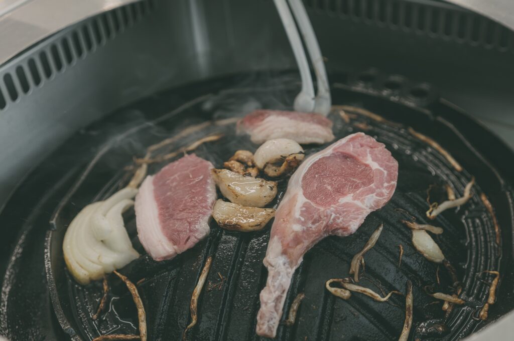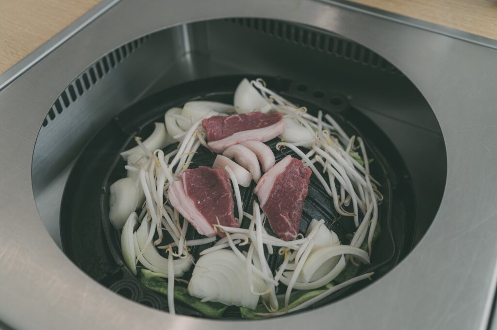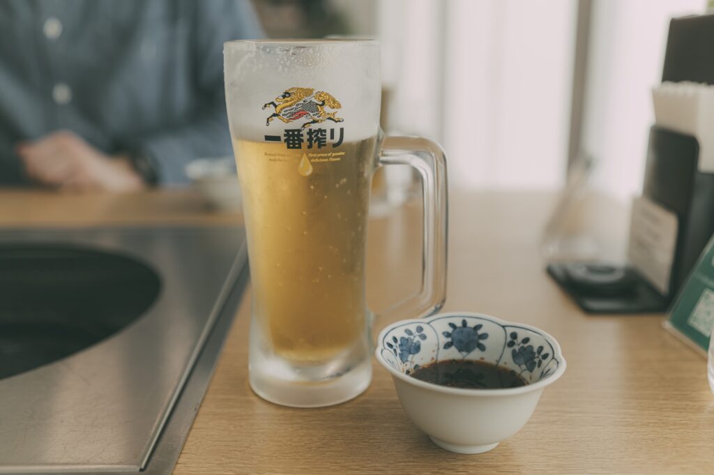 遠野のジンギスを堪能しつつ、とれたてホップの一番搾り(生)を頂く。